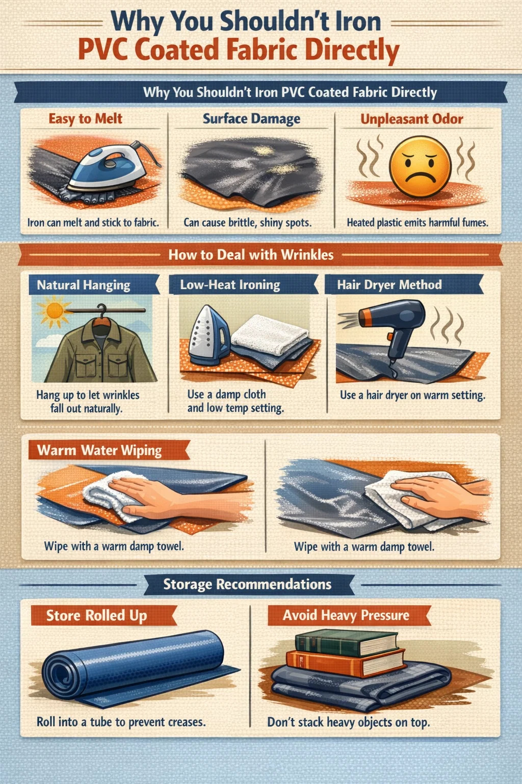Glačanje na niskoj temperaturi s platnenom zaštitom: Ako baš morate koristiti glačalo, namjestite ga na najnižu temperaturu. Stavite debelu, vlažnu pamučnu tkaninu na stražnju stranu tkanine presvučene PVC-om (strana bez premaza) kao tampon. Nikada nemojte dopustiti da glačalo izravno dodiruje tkaninu i neka se glačalo stalno kreće; nikada ga ne ostavljajte na jednom mjestu.