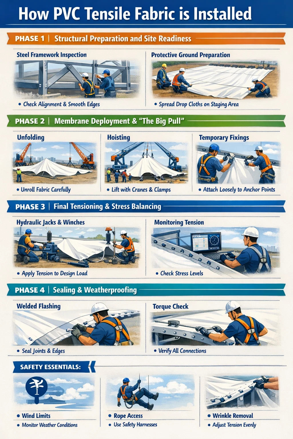 Prije PVC rastezljiva tkanina čak i kada stigne na gradilište, potporni kostur mora biti savršeno poravnat. Budući da rastezljive strukture raspoređuju opterećenja po cijeloj površini membrane, čak i manji neusklađeni čelični stupovi mogu dovesti do nabora ili strukturalnog kvara.