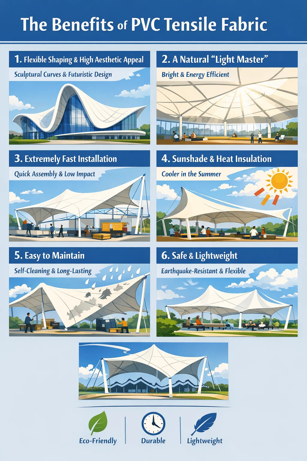 Govoreći o prednostima PVC rastezljiva tkanina , njegova popularnost u modernoj arhitekturi, posebno na stadionima, otvorenim trgovima i zasjenjenju krajolika, proizlazi iz njegovih brojnih jedinstvenih prednosti u odnosu na tradicionalne materijale.