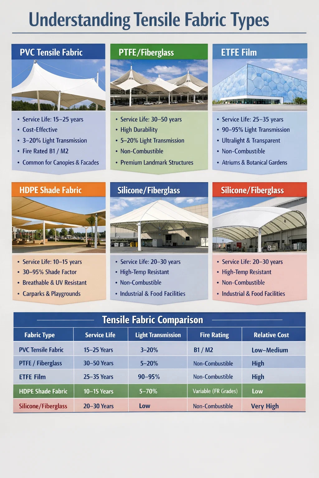 | PTFE/staklena vlakna | 30–50 godina | 5–20% | Nezapaljivo | visoko | Zračne luke, stadioni, krovovi znamenitosti |