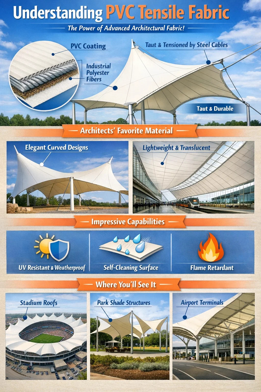 Svestrani oblici: Može se rastegnuti u oblike sedla, šatora ili razne elegantne obline. Često ćete vidjeti ove umjetničke oblike na stadionima, otvorenim kazalištima ili luksuznim parkiralištima.