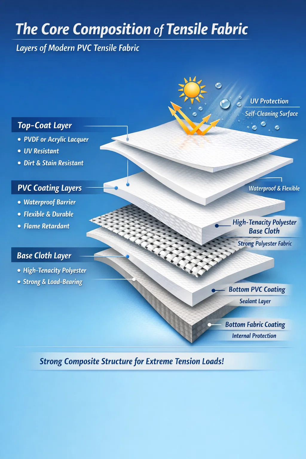 Najmodernije PVC rastezljiva tkanina je sofisticirani kompozitni materijal koji se sastoji od tri primarna sloja: a osnovna tkanina od poliestera visoke čvrstoće , gusta PVC (polivinil klorid) premaz , i specijalizirani završni lak kao što su PVDF ili akril. Unutarnja tkanina pruža strukturnu čvrstoću za podnošenje velikih opterećenja napetosti, dok vanjski plastični slojevi štite vlakna od degradacije okoliša, vode i vatre.