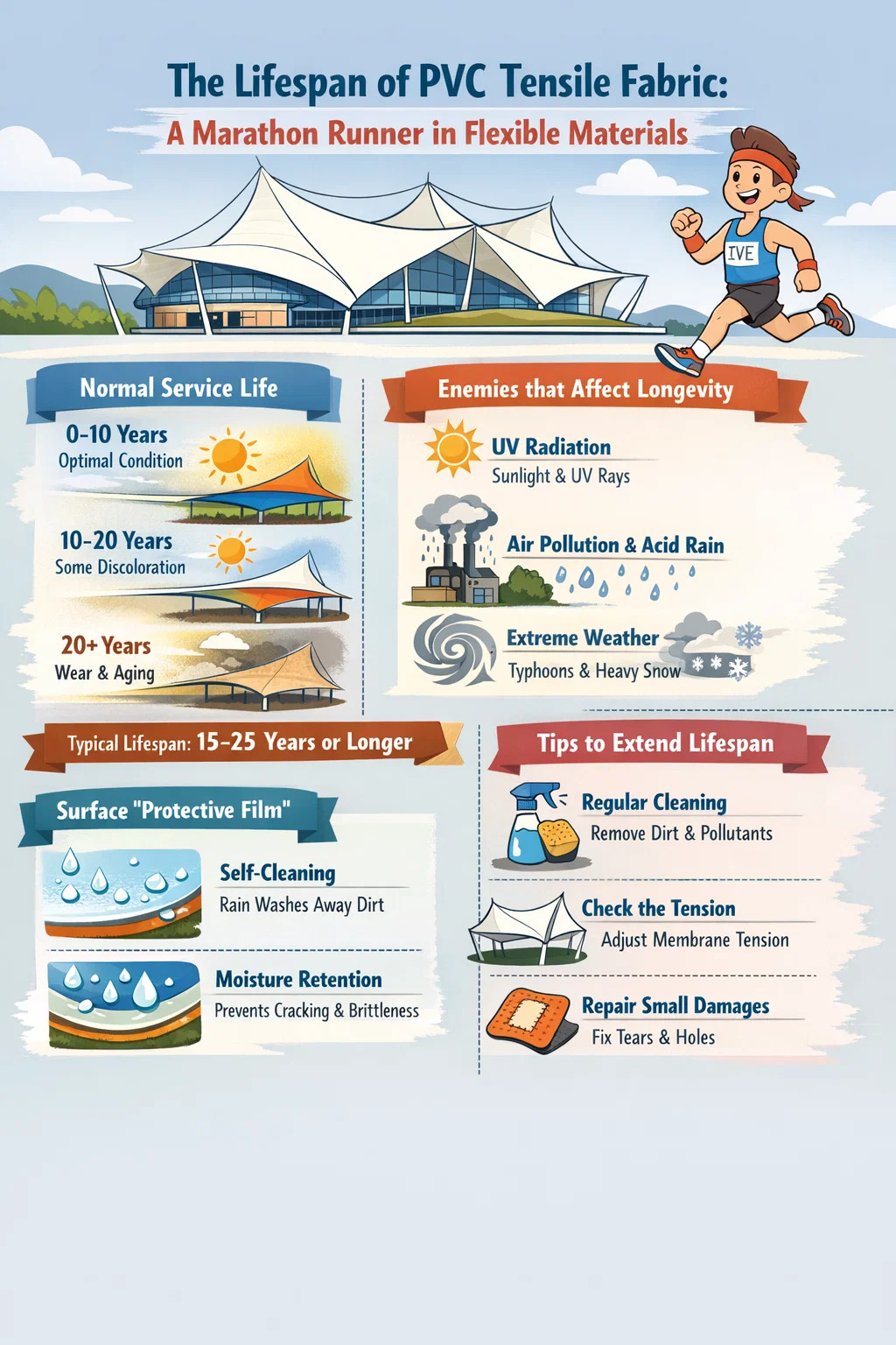 Pod normalnim održavanjem, visokokvalitetne strukture PVC rastezljive tkanine obično mogu trajati 15 do 25 godina, ili čak i duže.